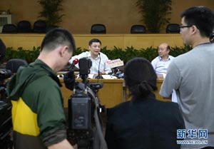 5月18日,杭州市環(huán)保局長(zhǎng)胡偉(左)在發(fā)布會(huì)上回答記者提問(wèn)。