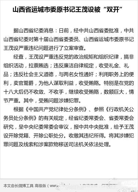 15、山西省運城市委原書記王茂設(shè)被“雙開”