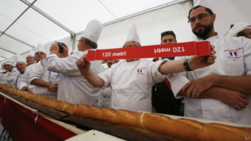 據(jù)悉,這個(gè)法式長(zhǎng)棍面包是由60名面包師,辛苦工作將近7個(gè)小時(shí)完成的。