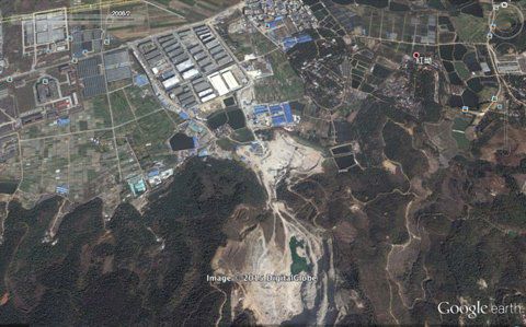 圖片來自谷歌衛(wèi)星圖。2008年2月,采石場內(nèi)碎石遍布白色一片,坑底大量積水已形成了一個小型水庫。
