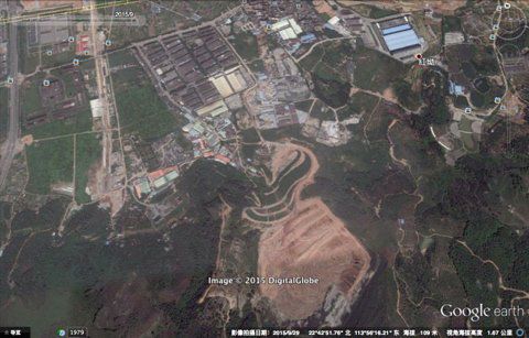 圖片來自谷歌衛(wèi)星圖。2015年9月,采石場已成為渣土填埋場,此前裸露在外的白色碎石被紅黃色的泥土所掩蓋。