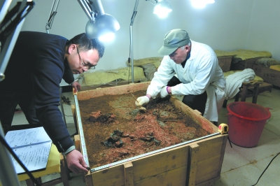 考古現(xiàn)場(chǎng)在緊張有序地準(zhǔn)備主棺柩吊運(yùn),實(shí)驗(yàn)室則在有條不紊地對(duì)先前發(fā)掘的文物進(jìn)行考古,主棺吊運(yùn)、文物清理保護(hù)兩不誤。這幾天,在文保用房里, 工作人員正在對(duì)偶車馬進(jìn)行清理記錄。據(jù)悉,清理中的偶車馬是先前在主墓甬道中發(fā)現(xiàn)的。工作人員在做每一層清理時(shí),都會(huì)留下豐富的資料,包括影像拍攝、文字 記錄、圖表繪制等。偶車馬的清理發(fā)掘,對(duì)研究西漢列侯出行制度有很大參考價(jià)值。