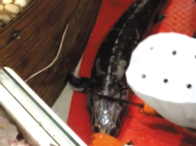 “現(xiàn)在外面鬧得沸沸揚(yáng)揚(yáng)的‘萬(wàn)元魚(yú)’就是這種。這種魚(yú)養(yǎng)一個(gè)月都不會(huì)死,養(yǎng)得越久個(gè)頭越大,就越像鰉魚(yú)?!弊鲷~(yú)生意已有20多年的大勇海鮮老板吳大勇指著池內(nèi)待售的鱘鰉魚(yú)說(shuō)。