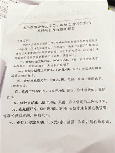 記者在一份由深圳龍華新區(qū)龍華辦事處辦公室出具的《關(guān)于調(diào)整交通綜合整治獎勵項目及標(biāo)準(zhǔn)的通知》的文件中發(fā)現(xiàn),為加大交通綜合整治力度,明確和細(xì)化交通綜合整治獎勵項目和標(biāo)準(zhǔn),保持交通執(zhí)法的工作積極性,辦事處決定對交通綜合整治獎勵項目和標(biāo)準(zhǔn)予以調(diào)整,其中加裝鐵甲的非法營運(yùn)三輪車每查處一輛獎勵600元,普通三輪摩托車、三輪電動車每輛獎勵100元,對無證駕駛、妨礙執(zhí)法當(dāng)事人實施行政拘留的,拘留一人獎勵500元。