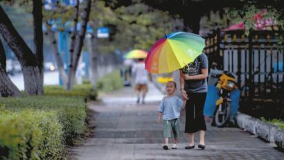 昨日下午3點左右,長春上空開始下起小雨。南湖大路上一位母親剛剛接到幼兒園放學的孩子 新文化記者 郭亮 攝