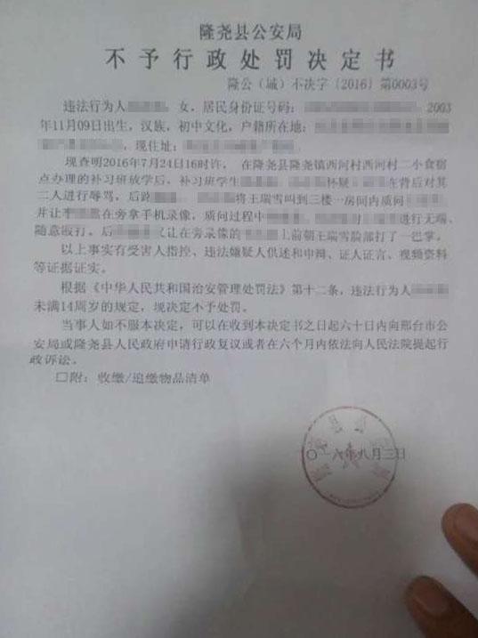 被害人家屬翻拍的一份由隆堯縣公安局對其中一名肇事學生開具的不予行政處罰決定書。7月24日下午,河北省邢臺市隆堯縣堯山中學一名初一學生,因為不愿意借錢而在補習班遭受了兩名女生長達4分鐘的辱罵、毆打,另一名學生還把整個過程用手機拍攝下來并上傳網(wǎng)絡,視頻在當?shù)乇化偪駛鞑ァ?/p>