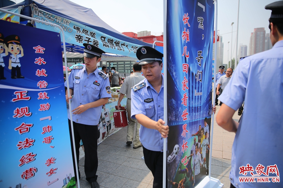 映象網(wǎng)訊 (記者 閆善良 文/圖)“你家人造(知道)嗎?”、“西班牙、英格蘭都回家了。哥們......咱也不在這添堵啦!”、“哥、姐,嫩(你們)別給這兒添堵啦?!?、“嘿,哥們!收攤兒回家看世界杯吧!”、“帥哥、美女,正規(guī)合法經(jīng)營(yíng)?!薄ⅰ敖鹚枪芨嬷?,醬紫(這樣子)不合適?!?月2日上午10時(shí)20分,鄭州市紫荊山地鐵站出入口,用網(wǎng)絡(luò)流行語(yǔ)寫成的十多塊宣傳板,呈弧形圍在一個(gè)占道經(jīng)營(yíng)商販的周圍,引來(lái)眾多市民圍觀。