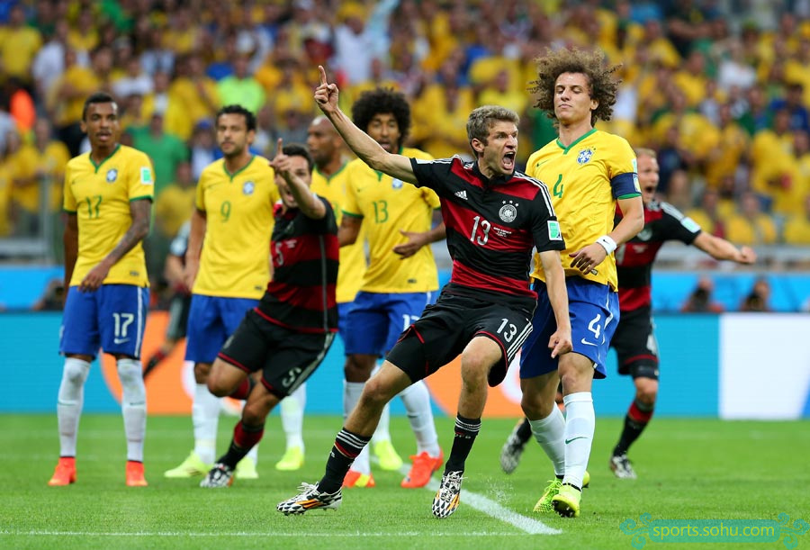 北京時間7月9日凌晨4時,2014年巴西世界杯首場半決賽在貝洛奧里藏特的米內(nèi)郎體育場進行,東道主巴西迎戰(zhàn)上屆季軍德國。最終,德國隊?wèi){借在18分鐘內(nèi)連入5球的攻擊狂潮以及下半場許爾勒替補登場后的梅開二度,7-1超大比分淘汰巴西,昂首晉級決賽。第10分鐘,穆勒利用角球機會首開紀(jì)錄。第22分鐘,克洛澤門前兩連擊攻入世界杯第16球,超越羅納爾多,成為世界杯進球第一人。第24分鐘和第25分鐘,克羅斯1分鐘內(nèi)連入2球。第28分鐘,赫迪拉又接厄齊爾傳球打進一球。第68分鐘,許爾勒又接拉姆助攻,門前包抄打門得手。第79分鐘,許爾勒禁區(qū)左側(cè)小角度攻入世界波。第90分鐘,奧斯卡才攻入挽回顏面的一球。