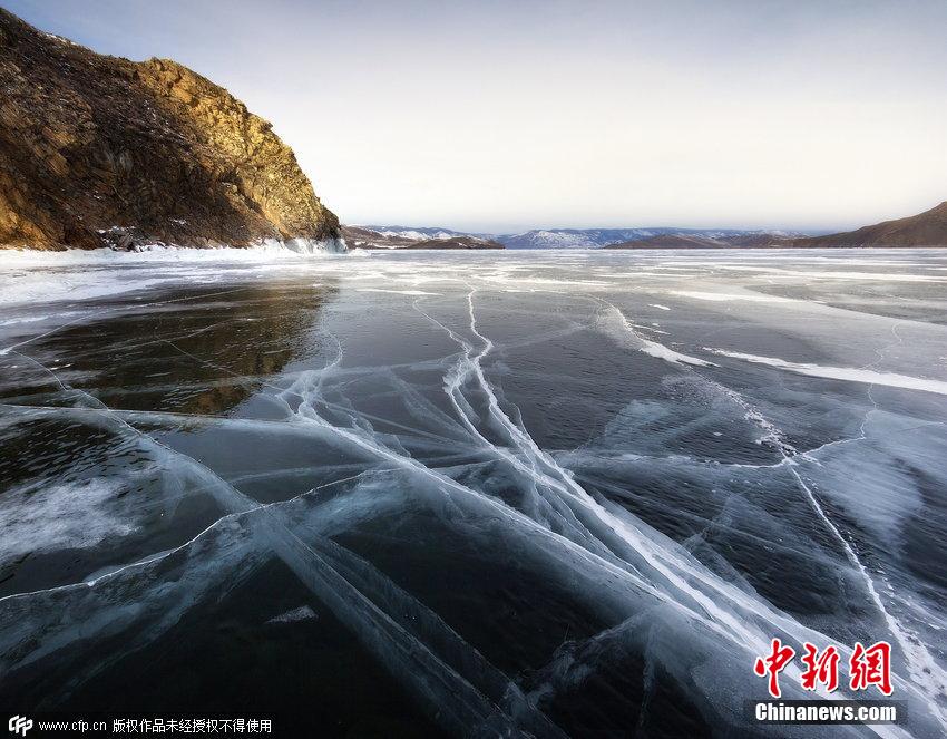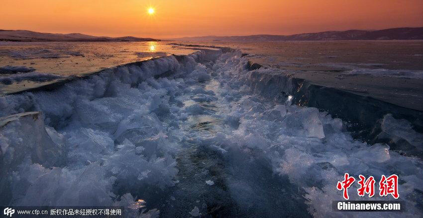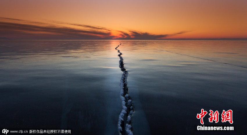 2015年4月1日消息,俄羅斯貝加爾湖面結(jié)冰,數(shù)百米長(zhǎng)的裂縫仿佛將世界一分為二,夕陽(yáng)的余暉灑在湖面上景色神奇迷人。