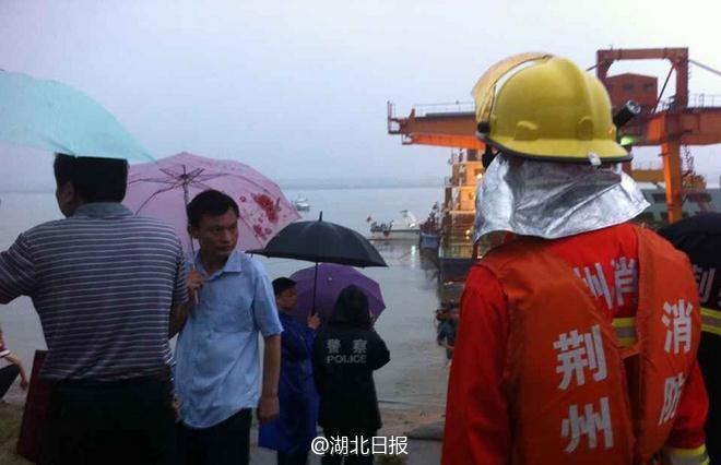 6月2日,消防救援人員在事發(fā)現(xiàn)場(chǎng)。 6月1日晚,一艘從南京駛往重慶的客船“東方之星”輪在長(zhǎng)江中游湖北監(jiān)利水域突遇龍卷風(fēng)發(fā)生翻沉。事發(fā)客船共有458人,其中旅客406人。圖為目前客船已沉入江中,呈倒扣狀,給救援工作造成極大困難。(楊宏斌、王馨、田悅)圖片來(lái)源:《湖北日?qǐng)?bào)》官方微博