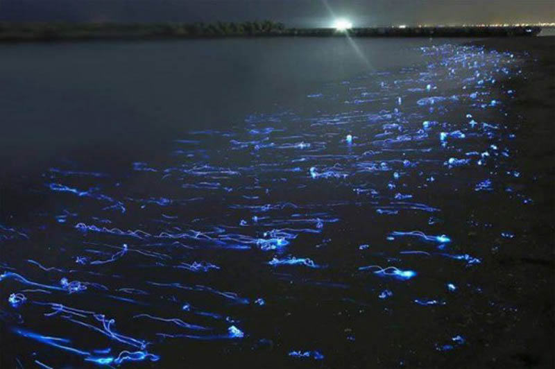 熒光烏賊是海洋中神奇的發(fā)光生物,通常只有7厘米長,具有復(fù)雜的表皮發(fā)光器和眼球發(fā)光器。在日本富山灣海下三四百米深的海溝中棲息著大量熒光烏賊,他們的一生大部分時間生活在海底,每年的3月至6月浮到海面產(chǎn)卵。每年這一時節(jié)的夜晚,聚集在富山灣沿岸的熒光烏賊協(xié)調(diào)一致地發(fā)出藍(lán)光,將整個海岸點亮,如夢如幻,成為富山灣獨特的風(fēng)景,吸引著眾多游客前來欣賞。