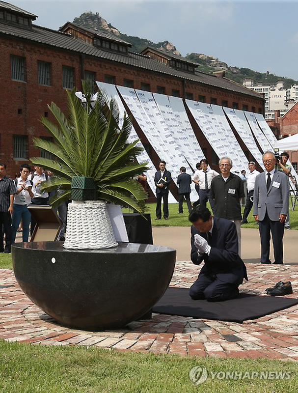 當(dāng)?shù)貢r間2015年8月12日,正在韓國訪問的日本前首相鳩山由紀(jì)夫參觀了首爾“西大門刑務(wù)所”博物館,并在追悼碑前跪地禱告。據(jù)悉,西大門刑務(wù)所始建于1908年,用于關(guān)押反抗日本殖民統(tǒng)治的韓國抗日義士。鳩山由紀(jì)夫表示,日本理應(yīng)承認殖民侵略歷史。(圖片來源:網(wǎng)絡(luò))
