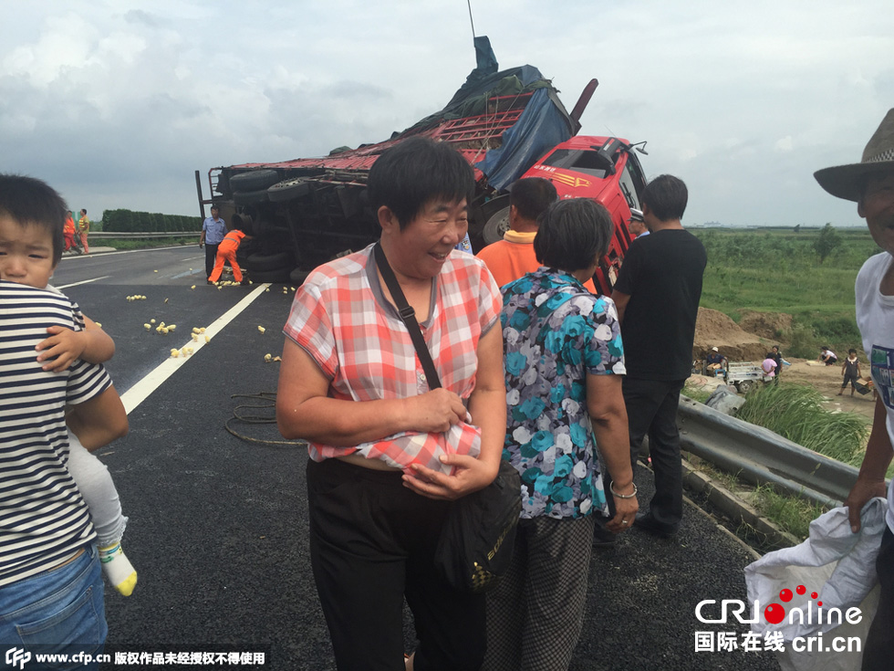 山東榮烏高速濱州沾化區(qū)段,一輛山東禽類運(yùn)輸車傾翻,數(shù)萬只小黃雞散落在地,附近村民聞?dòng)?,紛紛前來抓小雞。圖片來源:CFP