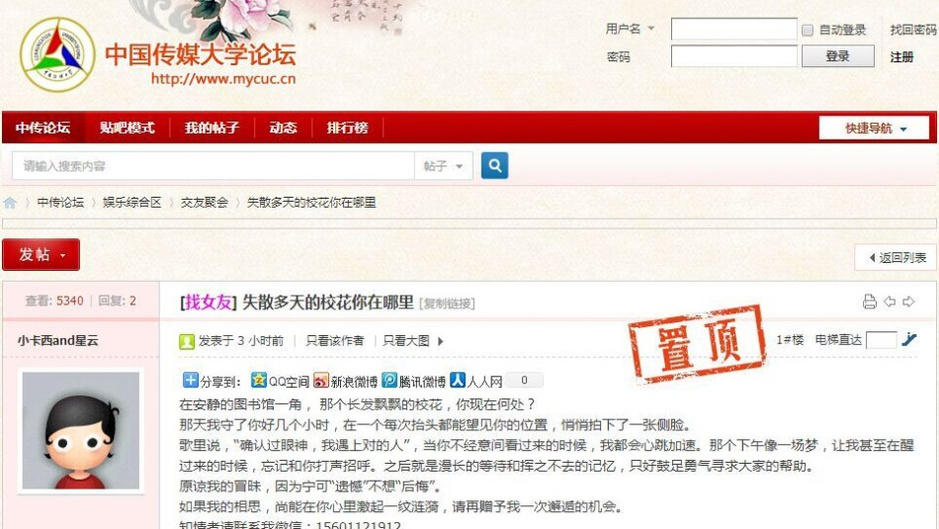 正值開學(xué)季,中國傳媒大學(xué)驚現(xiàn)癡情男,張貼了數(shù)百張海報只為表白?;?,據(jù)照片顯示,海報中有女孩側(cè)臉照片,還留下男生的聯(lián)絡(luò)方式,甚是精細。