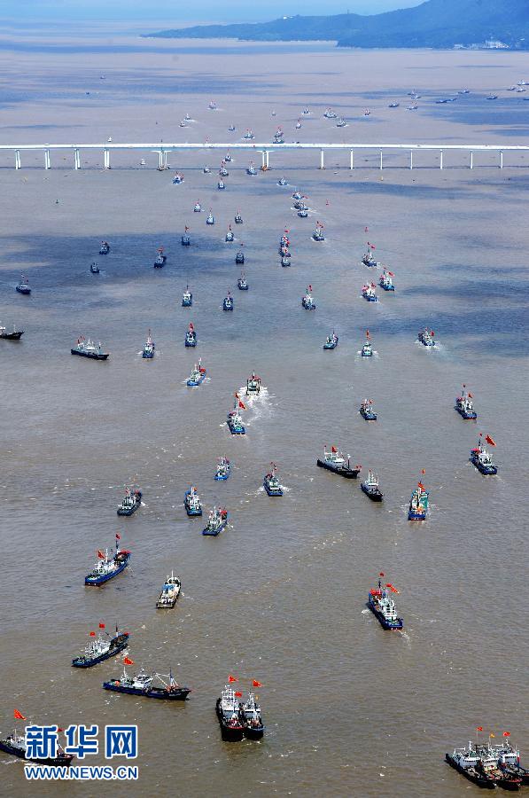 9月16日,浙江省舟山市沈家門漁港的漁船出港經(jīng)過(guò)朱家尖大橋開(kāi)赴漁場(chǎng)。當(dāng)日,為期3個(gè)半月的東海伏季休漁結(jié)束,眾多漁船劈波斬浪,開(kāi)往漁場(chǎng)。 新華社發(fā)(華志波 攝)