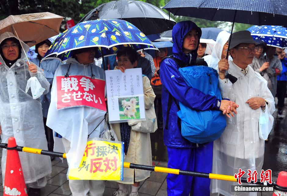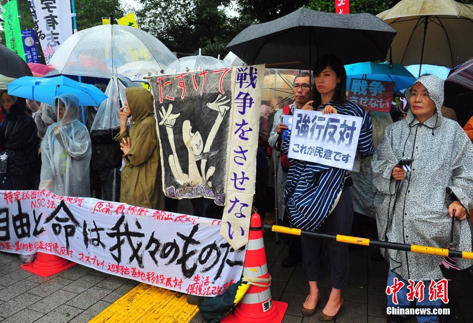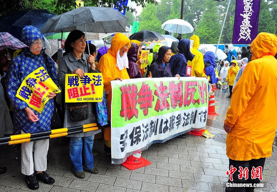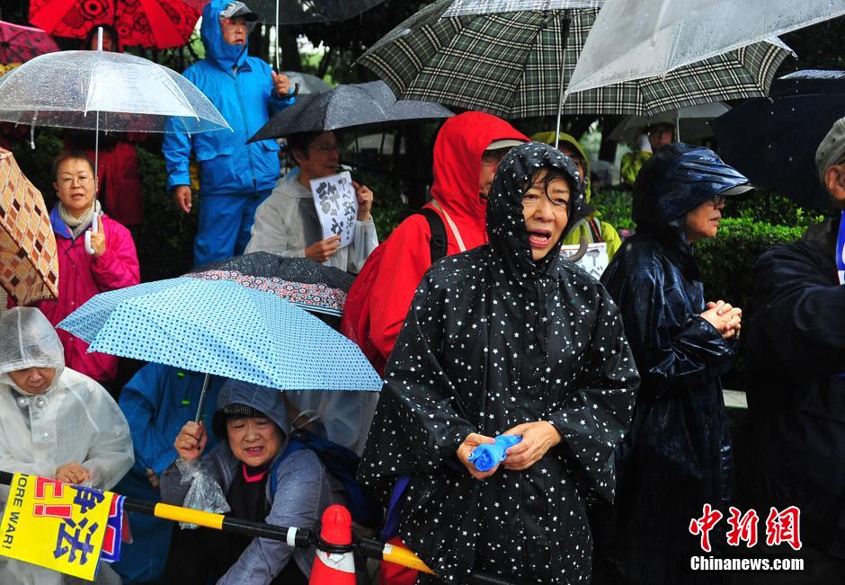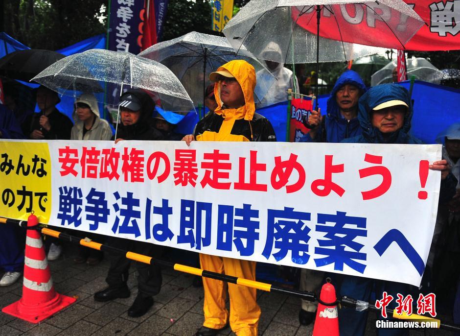 隨著安倍陣營強推以解禁集體自衛(wèi)權為核心內容的安保法案最終過關的計劃進入“倒計時”,日本民眾的反安??棺h活動再度進入高潮。在之前徹夜抗議之后,9月17日白天,又有眾多日本民眾冒著大雨持續(xù)聚集在國會周邊進行抗議活動。中新社發(fā) 王健 攝