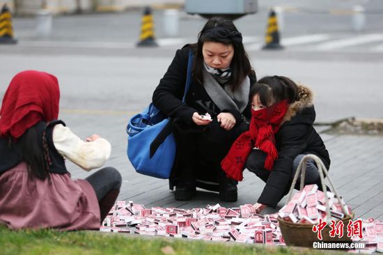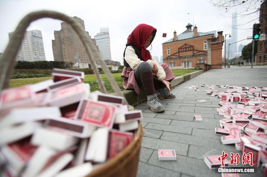 1月12日,上海外灘街頭出現(xiàn)一位小女孩,她身穿古典長裙,頭裹赭紅色圍巾,挎著裝滿火柴的小竹籃,在寒風(fēng)中向過往的路人送小火柴。據(jù)了解,這是一次“愛心衣櫥”幫助中國山區(qū)孩子擺脫寒冷的愛心募捐活動(dòng)。在寒冷的冬天,他們嘗試以“賣火柴的小女孩”活動(dòng),喚起社會(huì)的關(guān)注,把更多的溫暖傳遞到中國山區(qū)寒冷孩子的手上。只要掃一掃火柴盒上的二維碼,就可以立刻向山區(qū)孩子送上一套溫暖新衣。張亨偉 攝