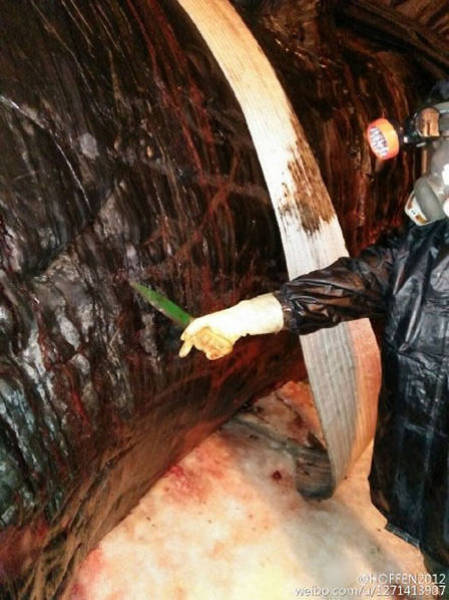 2016年2月14日至15日,江蘇如東洋口港海灘先后發(fā)現(xiàn)兩條抹香鯨擱淺死亡。19日,技術(shù)專家開(kāi)始抹香鯨的開(kāi)腹工作,其中一位專家進(jìn)入了抹香鯨的體內(nèi),在工作之時(shí)拍下了體內(nèi)的情況。