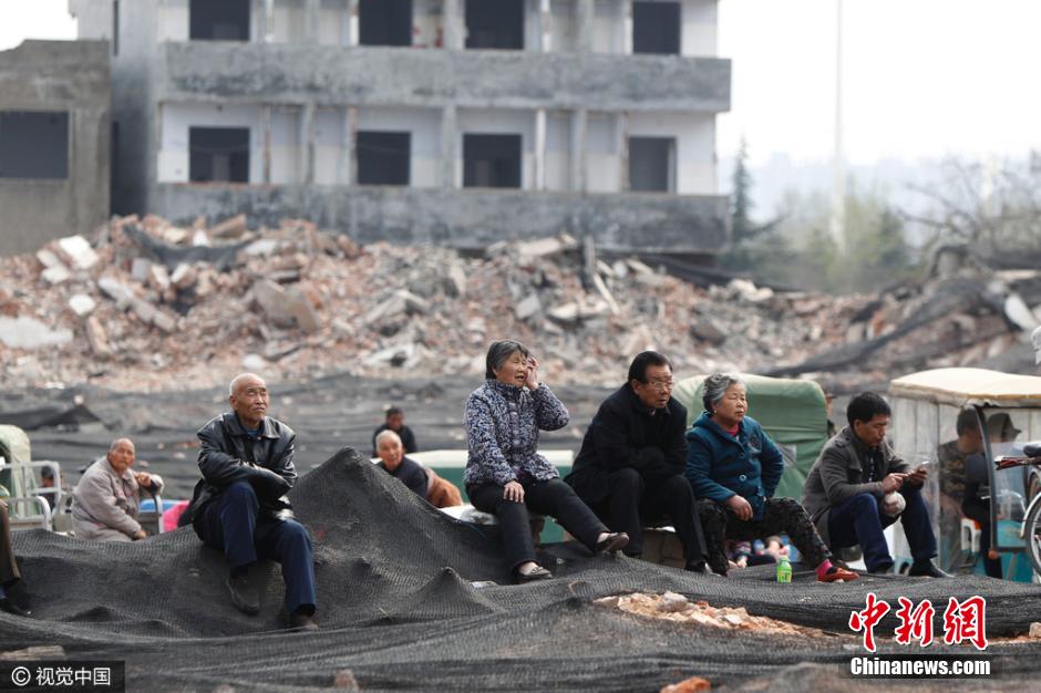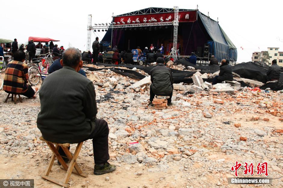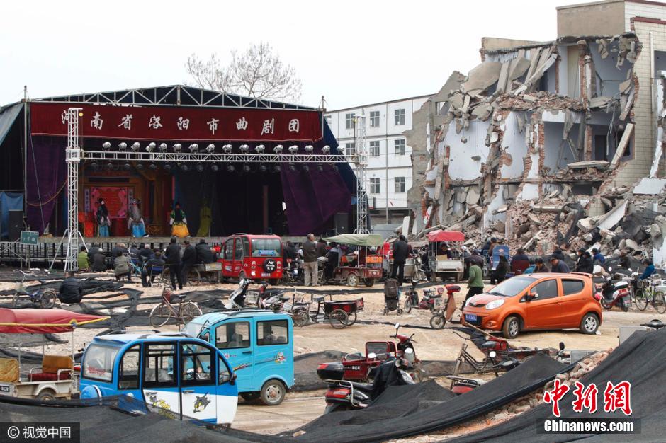 2016年3月23日,河南省鄭州市石佛村,拆遷后的都市村莊中,除了僅存的幾幢殘破的老樓外,其它民宅基本被夷為平地。在一個籃球場大小的鋼結構戲臺出現在瓦礫廢墟之上,一出出豫劇正連軸上演。戲臺上,豫劇演員拉足了唱腔,傾力獻唱;戲臺下,數百名老人,扎堆擠做在大片碎磚之上沉醉于精彩唱段和劇情之中。放眼已成廢墟村莊,移動式的露天戲臺在殘磚碎之中,頗顯歷史滄桑。圖片來源:視覺中國