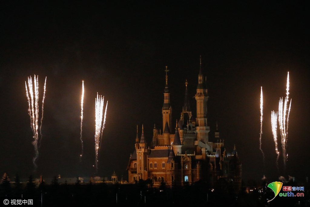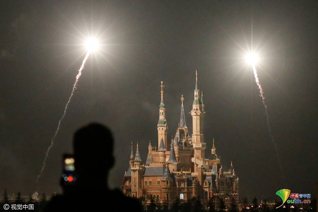 3月28日9點06分,在上海迪士尼樂度假區(qū)內(nèi)中心位置,“奇幻童話城堡”上空及周圍十幾支煙花直指天空,一粒粒金砂噴射而出,在空中綻放,原本漆黑一片的園區(qū)在焰火的襯托下顯得絢麗多彩。每組焰火間隔時間為3-4分鐘。