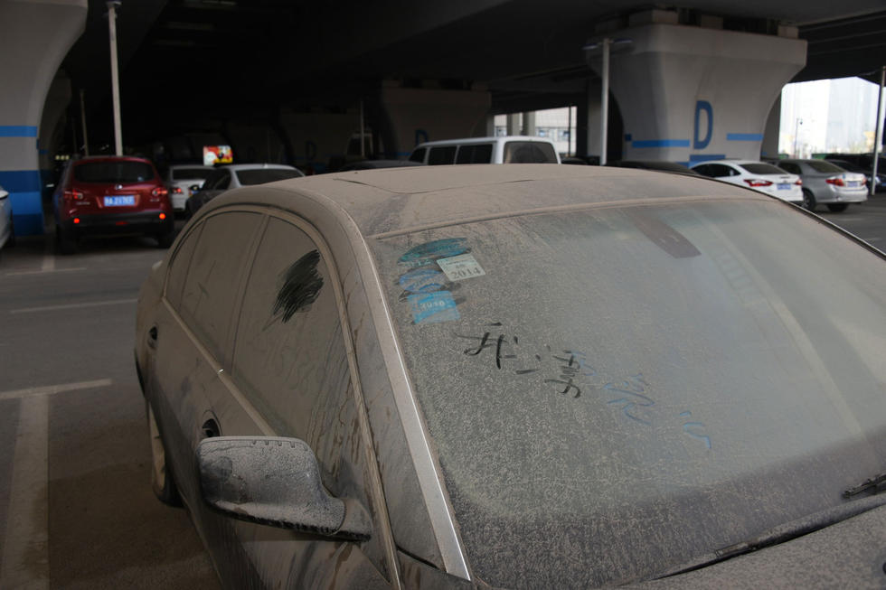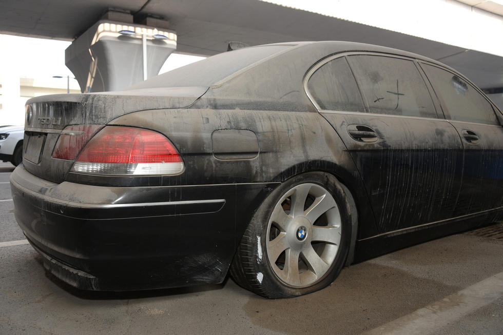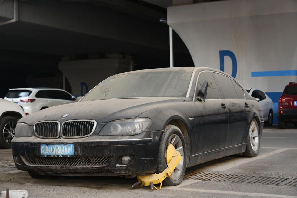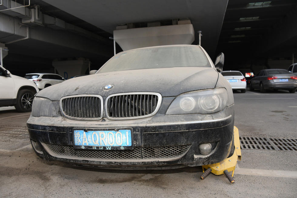 上午7時(shí)30分,中興路附近的高鐵站北區(qū)停車場,在入口處東側(cè),這輛“蓬頭垢面”的寶馬車車全身落滿了塵土,已呈灰色。其實(shí),這是一輛價(jià)值過百萬的黑色寶馬750LI。該車的右前后輪已經(jīng)癟了,左前輪被上了鎖。在車后備箱左側(cè)上方有一處凹陷,但不太明顯。后引擎蓋上被人寫上“下雨了”字樣。車的縫隙處堆積著厚厚的塵土,顯然,這輛寶馬車已經(jīng)在此停放已經(jīng)有很長時(shí)間了。