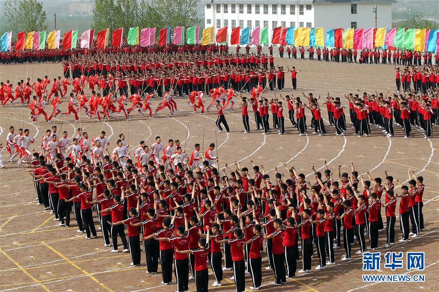 4月7日,在河南登封少林塔溝武術(shù)學(xué)校練功場,上課間操的學(xué)員進(jìn)行隊(duì)形變換。當(dāng)日,河南登封少林塔溝武術(shù)學(xué)校2016年“春訓(xùn)”拉開帷幕,2.6萬名學(xué)員同上陣,進(jìn)行隊(duì)形變換、十八般兵器、少林硬氣功、少林集體棍等多種功法演練。“春訓(xùn)”是少林塔溝武術(shù)學(xué)校每年春季開展的一項(xiàng)強(qiáng)化訓(xùn)練活動,旨在提升學(xué)員的耐力和競技狀態(tài)。新華社發(fā)(牛書培 攝)