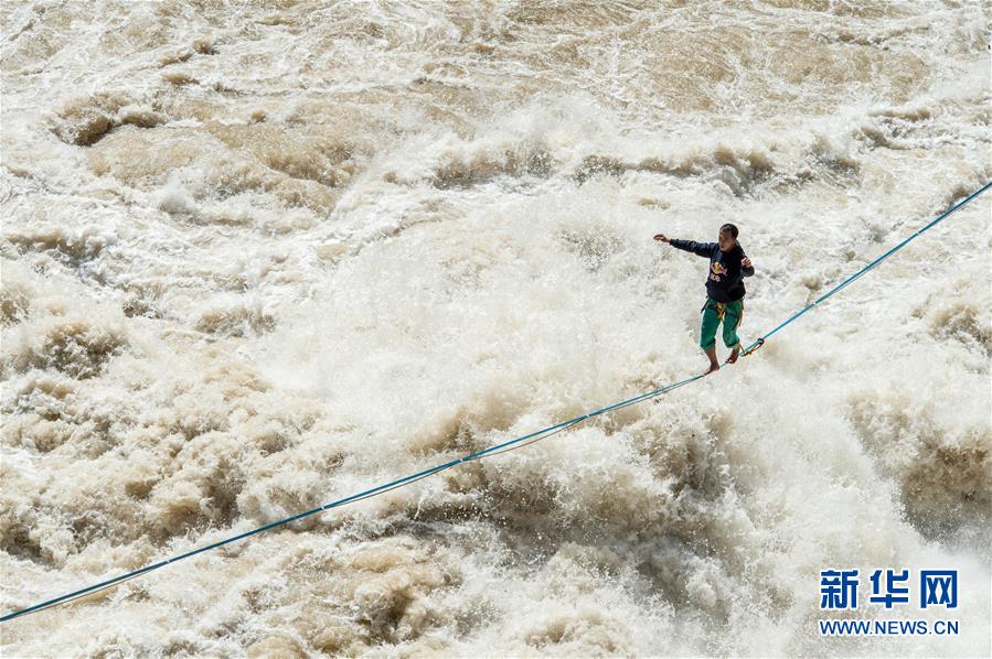 4月26日,張亮在扁帶上行走。當(dāng)日,在云南香格里拉的長江天險(xiǎn)虎跳峽上,“中國扁帶第一人”張亮利用寬度只有2.5厘米的扁帶,在距離江面16米的高度上成功行走60米,耗時(shí)5分58秒抵達(dá)虎跳峽香格里拉一側(cè)的終點(diǎn)完成挑戰(zhàn)。