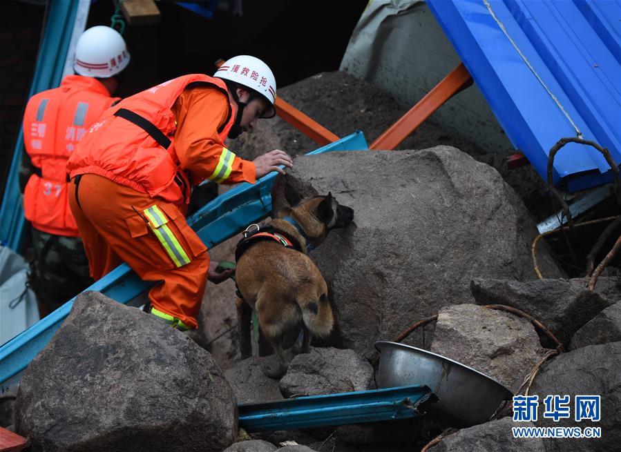 5月8日,消防人員利用搜救犬在現(xiàn)場尋找生命跡象。