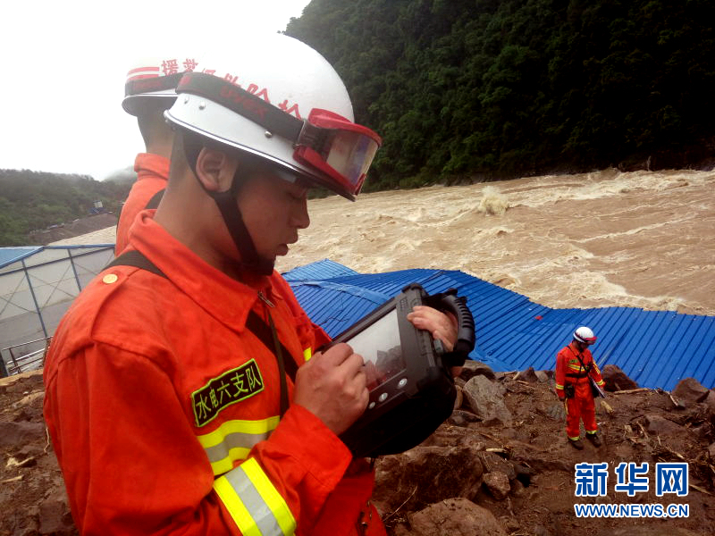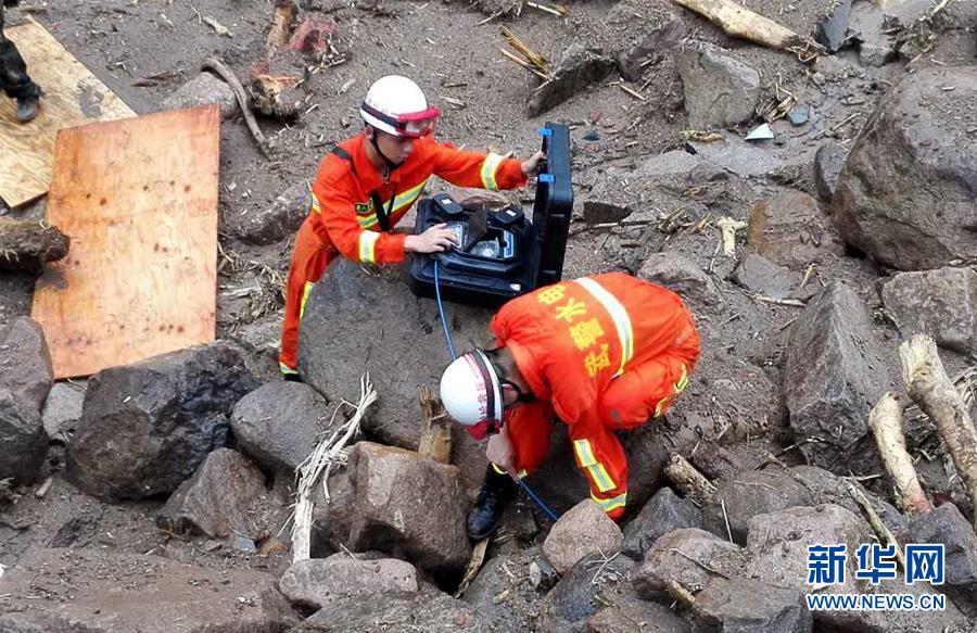 5月8日,在福建泰寧山體滑坡救援現(xiàn)場,武警水電二總隊六支隊官兵利用“雷達生命探測儀”對任務(wù)區(qū)進行搜救(手機拍攝)。