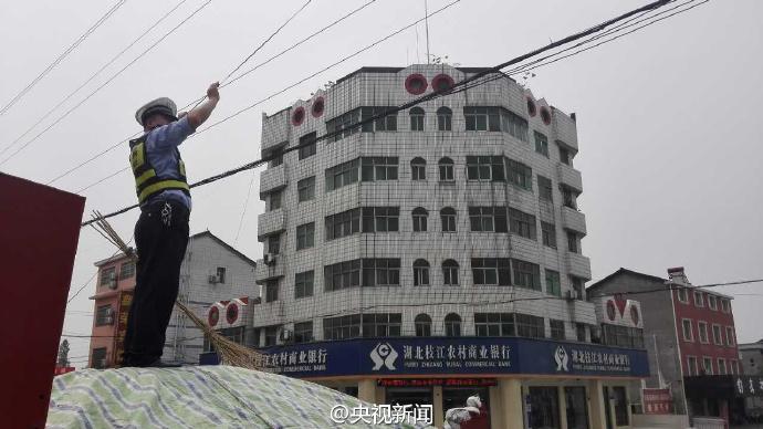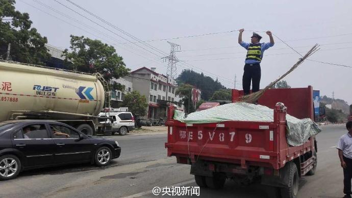 近日,在湖北宜昌一路段,電信光纜被風(fēng)刮斷,導(dǎo)致道路擁堵。交警董金橋?qū)⒐饫|奮力托起,留出空間保障車輛通行。一個(gè)多小時(shí)后,電信工作人員趕到搶修,直到線纜復(fù)位,董金橋才放下手臂休息。 央視記者 魏軼 圖片來源:央視新聞官方微博