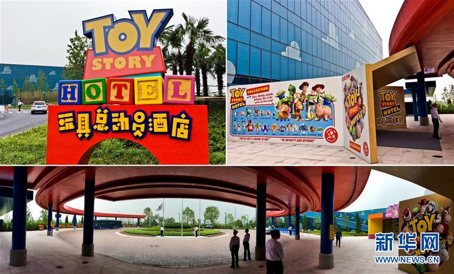 5月15日拍攝的上海迪士尼玩具總動(dòng)員酒店入口標(biāo)志(左上)、酒店大門(右上)和酒店大堂(下)(拼版圖片)。當(dāng)日,上海迪士尼主題酒店之——玩具總動(dòng)員酒店大堂、廣場(chǎng)、餐廳、度假區(qū)短駁車等區(qū)域及設(shè)施開始內(nèi)部測(cè)試。這家共有800個(gè)房間的主題酒店將于6月中旬正式迎客。新華社發(fā)(鈕一新 攝)