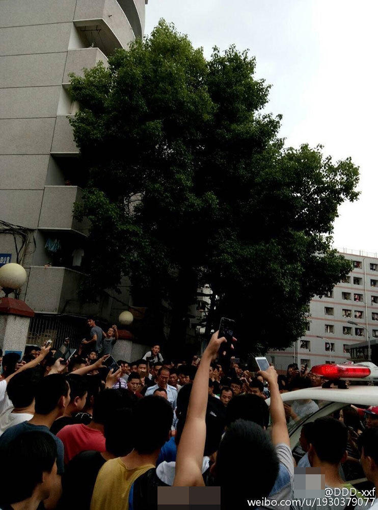 在小偷被攔下后,現(xiàn)場的喊聲驚動了更多路過的學生,不到半分鐘時間,兩棟樓內的男生迅速跑下樓,現(xiàn)場近百名學生將小偷圍得水泄不通。