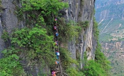 15個孩子中多數(shù)是女孩,在三個家長的保護下,背著沉沉的書包,大約用了2個小時,到達“懸崖村”。村里通向外界,需要順著懸崖斷續(xù)攀爬17條藤梯,其中接近村莊的幾乎垂直的兩條相連的藤梯長度約100米,沒有藤梯的崖壁才是最危險的。據(jù)支爾莫鄉(xiāng)黨委書記阿皮幾體講,他知道的在這條路上摔死的人有七八個,有村里的人,也有外來的人,而摔傷的人更多。