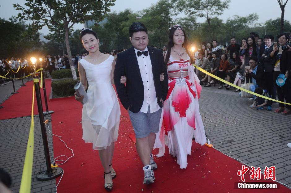 6月3日晚,山西大學(xué)美術(shù)學(xué)院畢業(yè)典禮,大學(xué)畢業(yè)生通過(guò)紅地毯走進(jìn)會(huì)場(chǎng),學(xué)弟學(xué)妹們夾道歡迎。當(dāng)畢業(yè)生情侶一起走秀時(shí),引起學(xué)弟學(xué)妹們一陣尖叫。韋亮 攝
