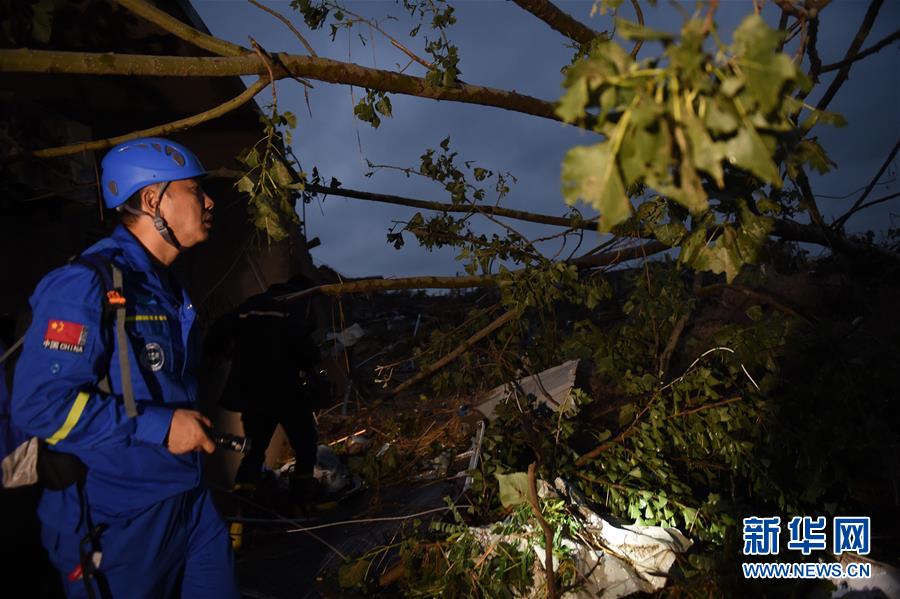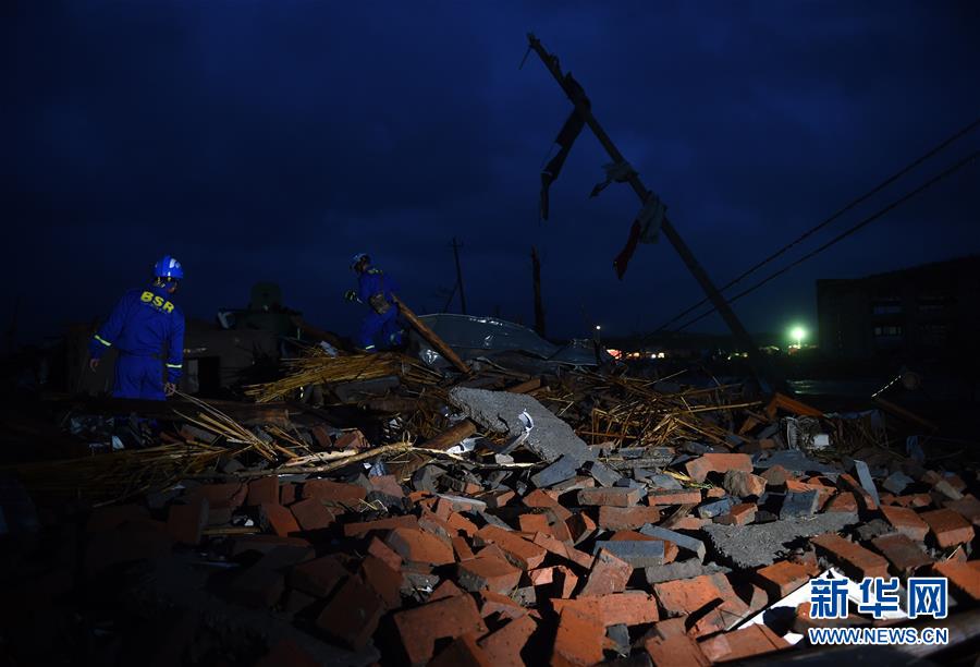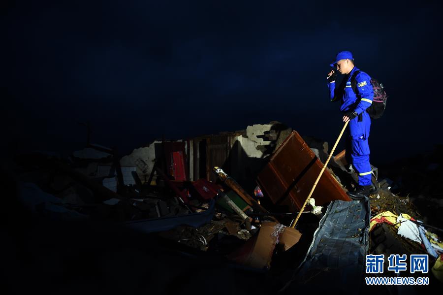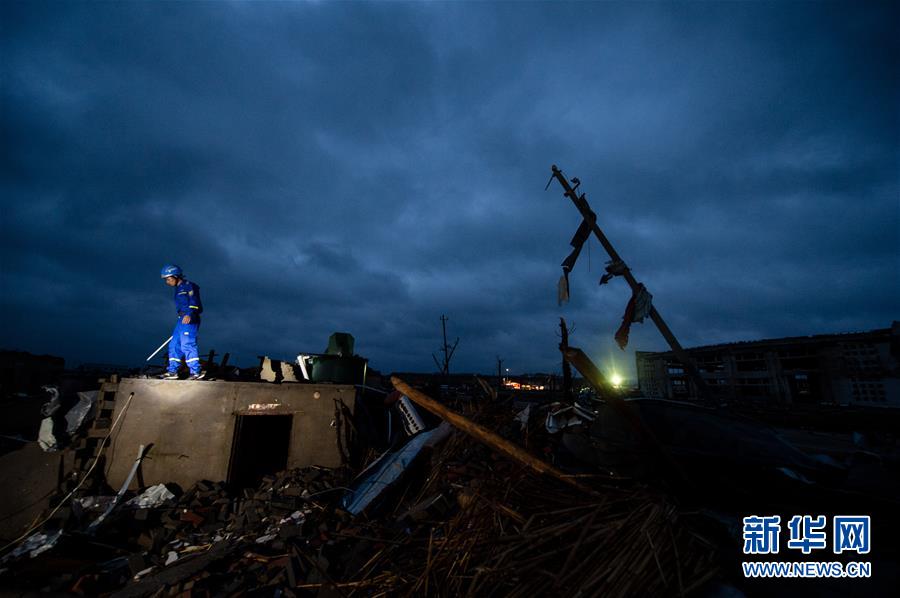 6月24日黎明,搜救人員在鹽城市阜寧經(jīng)濟(jì)開發(fā)區(qū)北陳村進(jìn)行排查搜救。新華社記者韓瑜慶攝