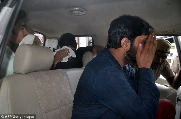 受害女子稱:“我離開學(xué)校,看見了他們,相同的5個人。我非常害怕?!笔芎θ烁嬖V當(dāng)?shù)匾患译娨暸_,“他們強迫我進入車?yán)?,試圖扼死我。他們威脅說要殺死我的父親和兄弟?!眻D為3名涉嫌強奸女子的嫌疑人被捕時,用手遮住臉。