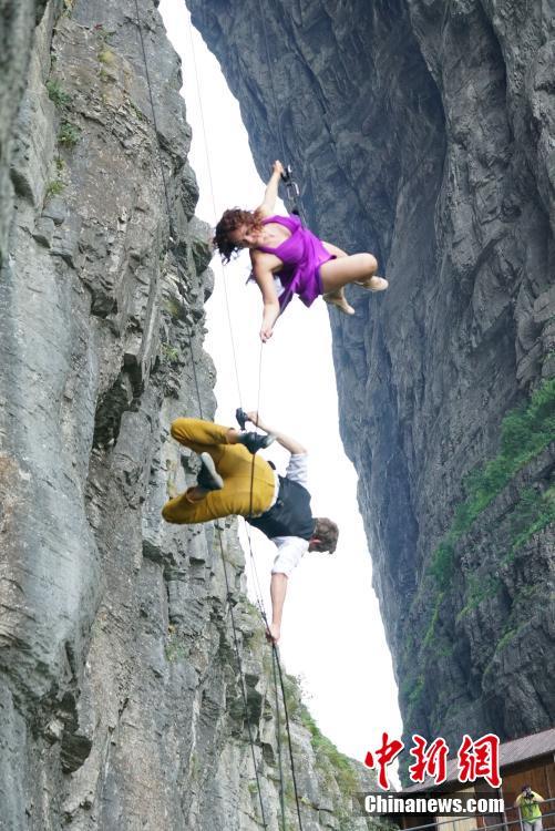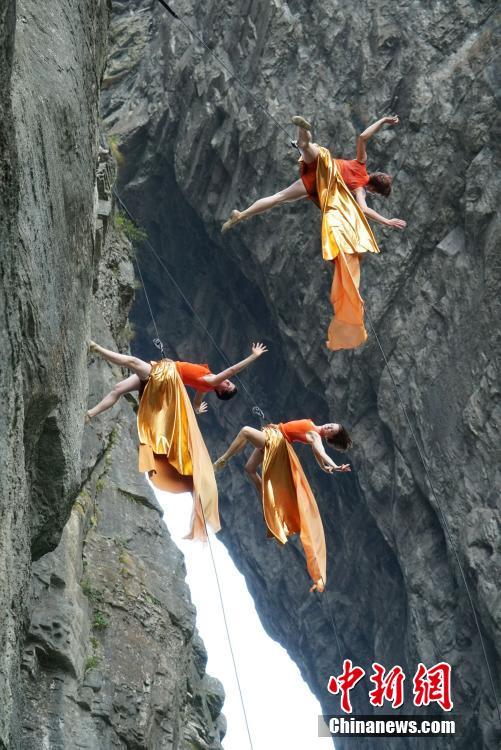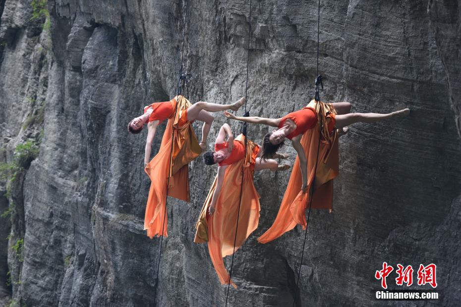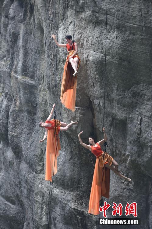 9月13日,美國BANDALOOP高空舞蹈團(tuán)在湖南張家界天門山的懸崖絕壁間盡情展現(xiàn)“垂直舞蹈”的藝術(shù)與魅力,其優(yōu)雅而驚險(xiǎn)的舞姿與鬼斧神工般的自然奇景融合、互動(dòng),吸引了不少游客駐足欣賞。中新社發(fā) 向韜 攝