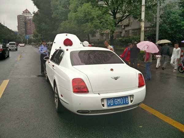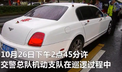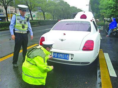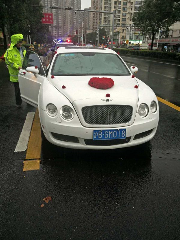 下午2點(diǎn)45分許,上海交警總隊(duì)機(jī)動支隊(duì)巡邏時,在周家嘴路近大連路處發(fā)現(xiàn)一路婚車車隊(duì),共計(jì)5輛車,其中領(lǐng)頭的是懸掛“滬BGM018”牌號的白色賓利歐陸跑車。后經(jīng)查實(shí),此車為套牌車。
