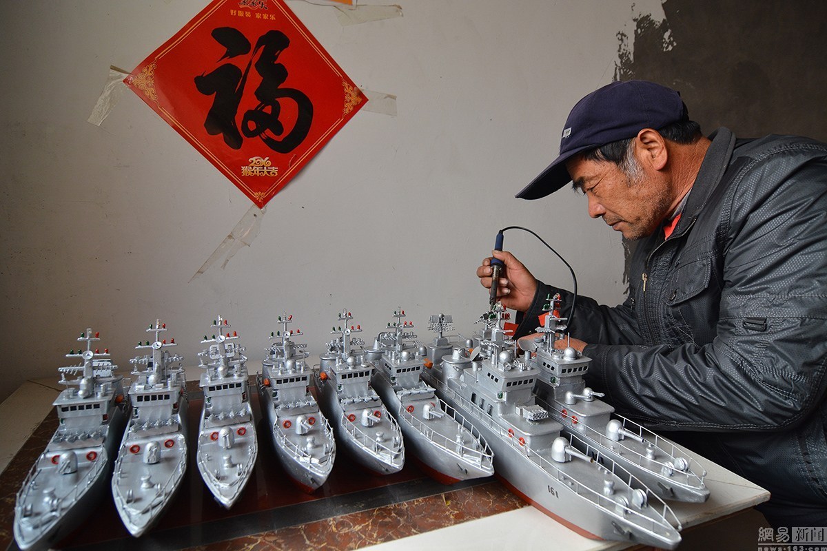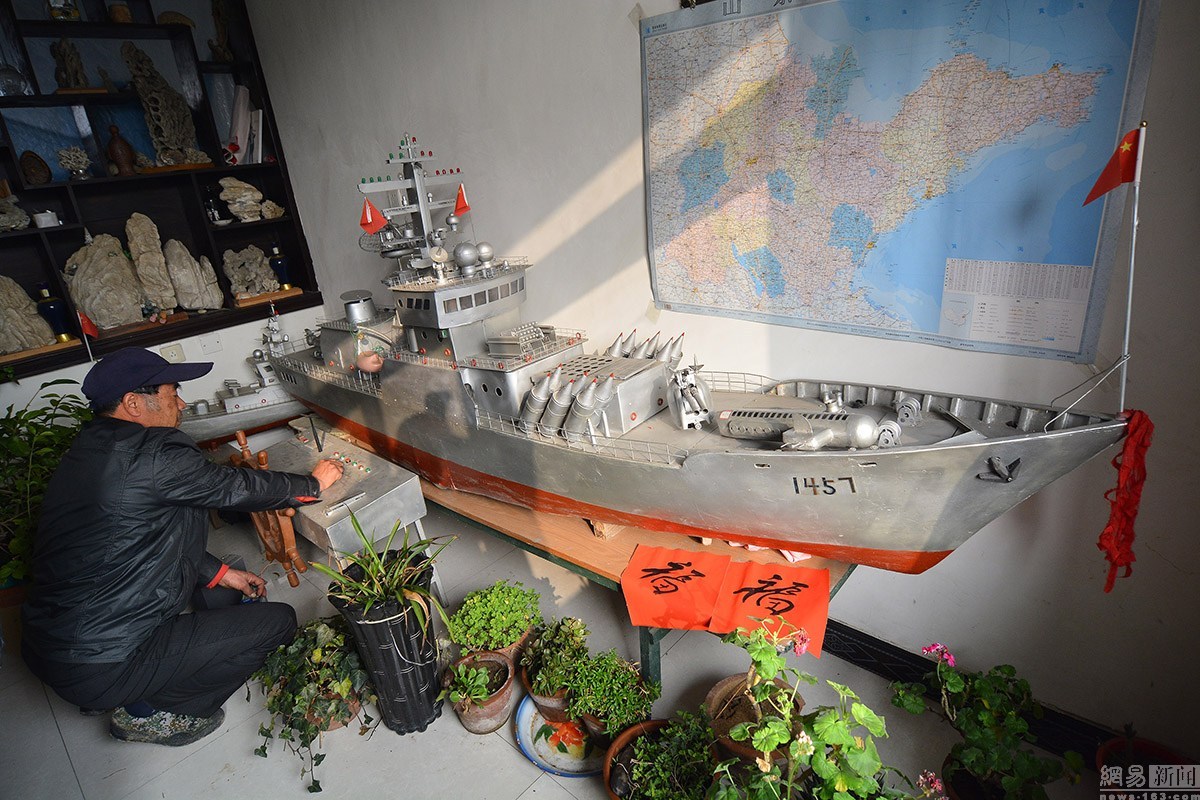 郭長海,初小文化,當過27年的船長。2005年,迫于海洋漁業(yè)的枯竭,他將漁船賣掉。但是仍然割舍不了對大海的依戀之情。平時,他喜歡從電視上了解國家大事,最愛看軍事頻道,耳濡目染,于是對軍艦產(chǎn)生了濃厚的興趣。農(nóng)閑的時候,郭長海便琢磨起了艦艇模型的制作。