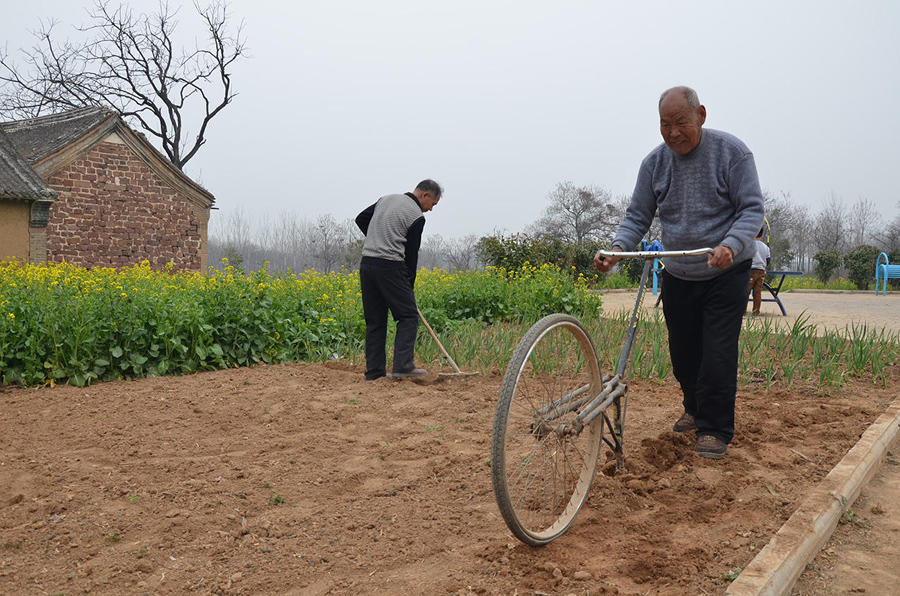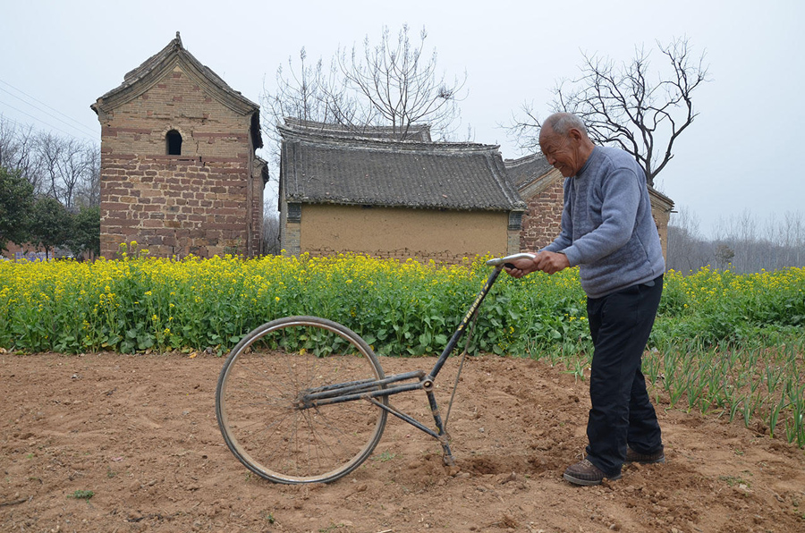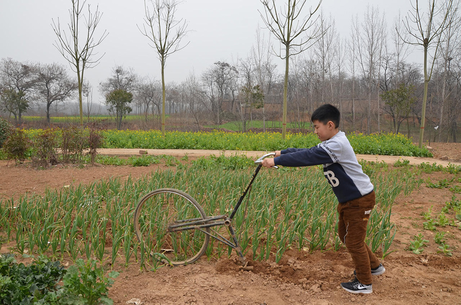 這種種菜的小地塊,推拖拉機(jī)過(guò)來(lái)翻有點(diǎn)兒擱不住,拿鋤頭鋤又有些費(fèi)力,還好有這個(gè)神奇單車,連小孩子都能干活了。
