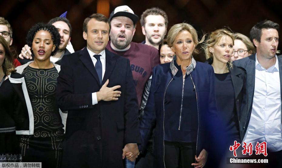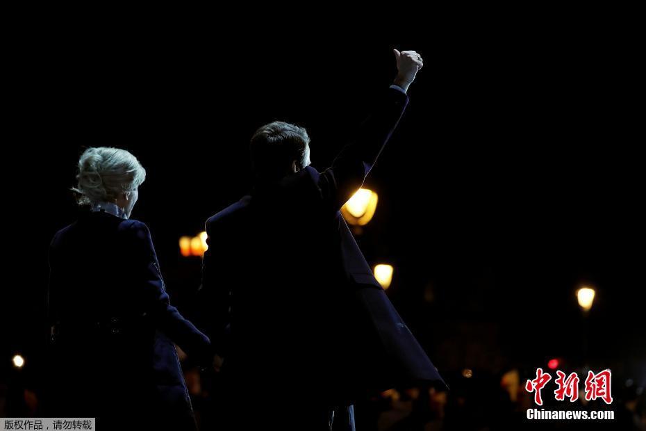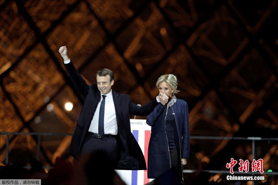 巴黎時間5月7日晚,法國總統(tǒng)選舉第二輪投票初步計票結果顯示,中間派獨立候選人、“前進”運動領導人埃馬紐埃爾·馬克龍以大幅優(yōu)勢擊敗極右翼政黨“國民陣線”候選人馬麗娜·勒龐。年僅39歲的馬克龍由此成為法國史上最年輕的總統(tǒng),也成為世界上最年輕的大國領導人。圖為馬克龍(左二)和妻子布麗吉特(右二)在慶祝勝選的集會上向支持者致意。中新社記者 龍劍武 攝