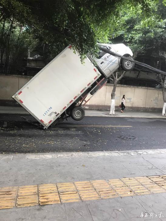 5月10日早上,成都高升橋北街,一輛貨車玩起“特技”,車頭掛在線纜上,四輪騰空,造成道路擁堵,索性無人員傷亡。隨后,記者從成都交警一分局獲悉,該事故的罪魁禍首,是掉落的通訊線纜。來源:華西都市報