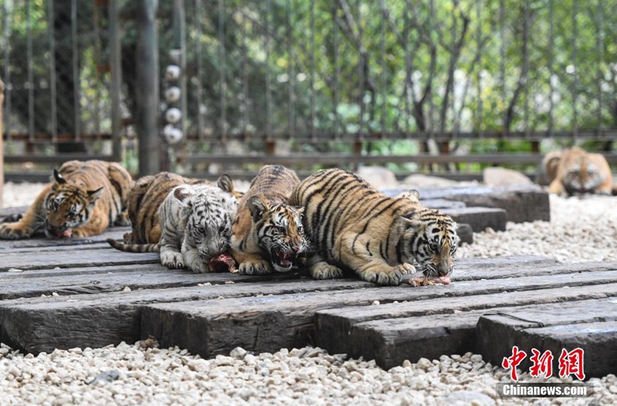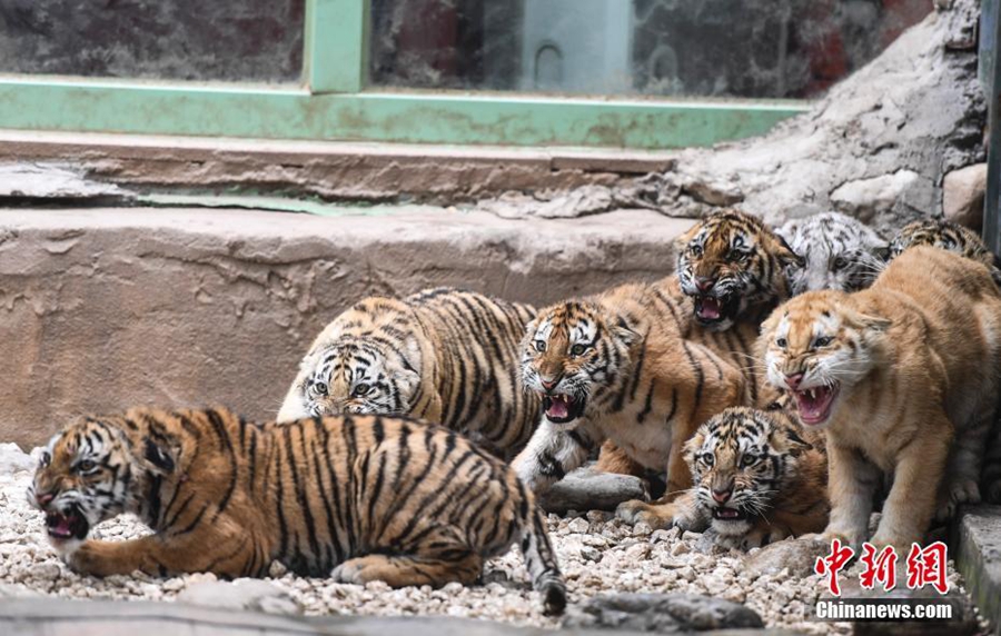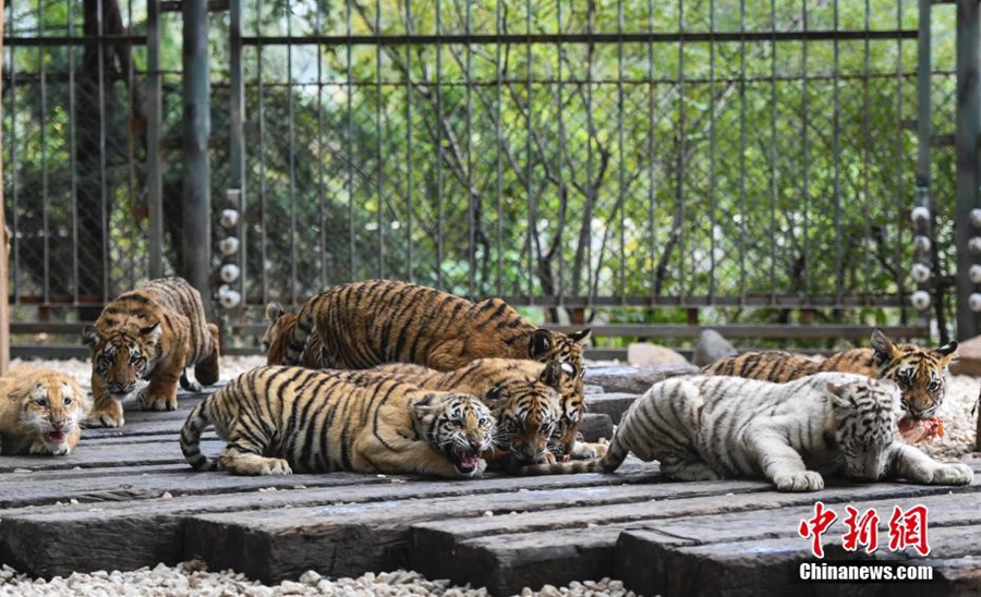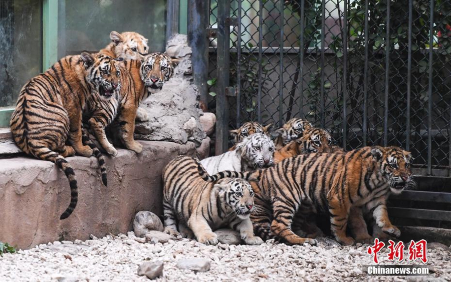 10月17日,濟南野生動物世界2017年誕生的12只小老虎集中亮相,霸氣模樣吸引許多游客駐足觀賞。據悉,濟南野生動物園2017年共繁育成活26只小老虎,其中2只是“虎中極品”金虎。 中新社記者 張勇 攝
