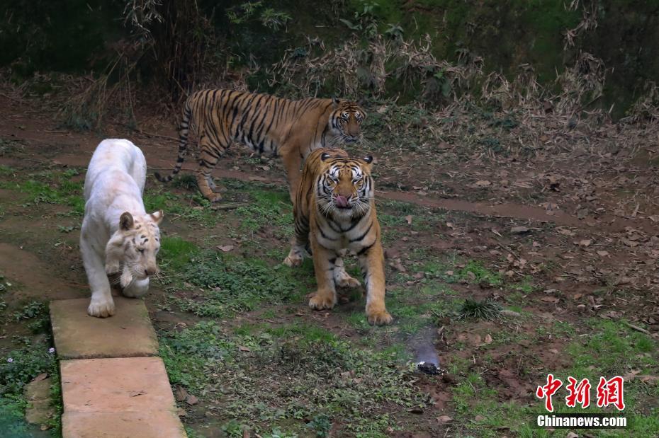 另一群老虎圍著電池打量,其中一只突然上前咬上一口,電池瞬間爆燃冒煙。王成杰 攝