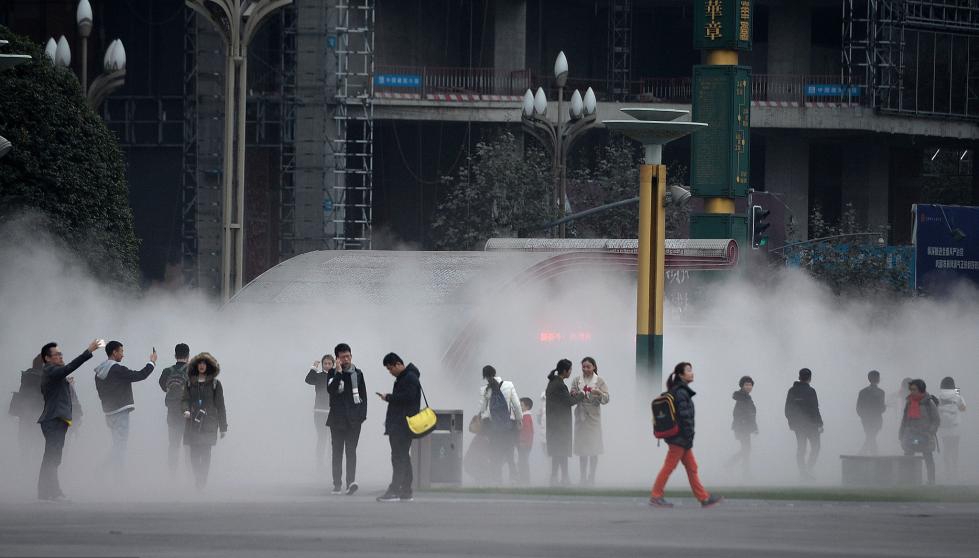 記者注意到,水霧來源于草叢中的多個(gè)隱形噴頭。這項(xiàng)讓天府廣場有些“仙味兒”的變化,正是成都推進(jìn)大氣污染防治科技治霾的新動(dòng)作——打開這個(gè)名為“超細(xì)清水霧系統(tǒng)”的除霾裝置,可以降解距離地面10米以內(nèi)的漂浮揚(yáng)塵顆粒物,起到除霾、降塵、降溫、增加空氣濕度、增加負(fù)氧離子的作用。