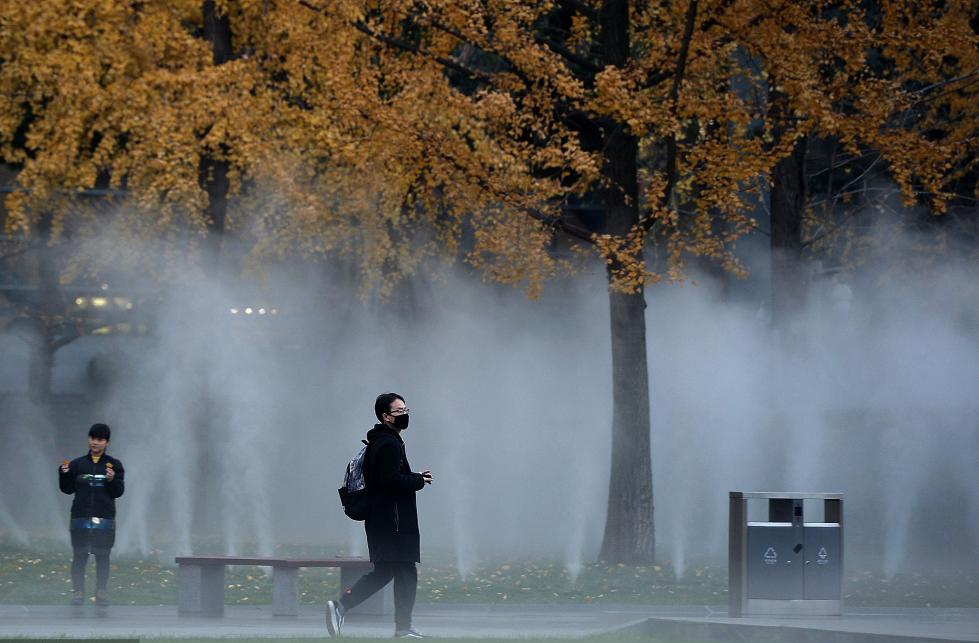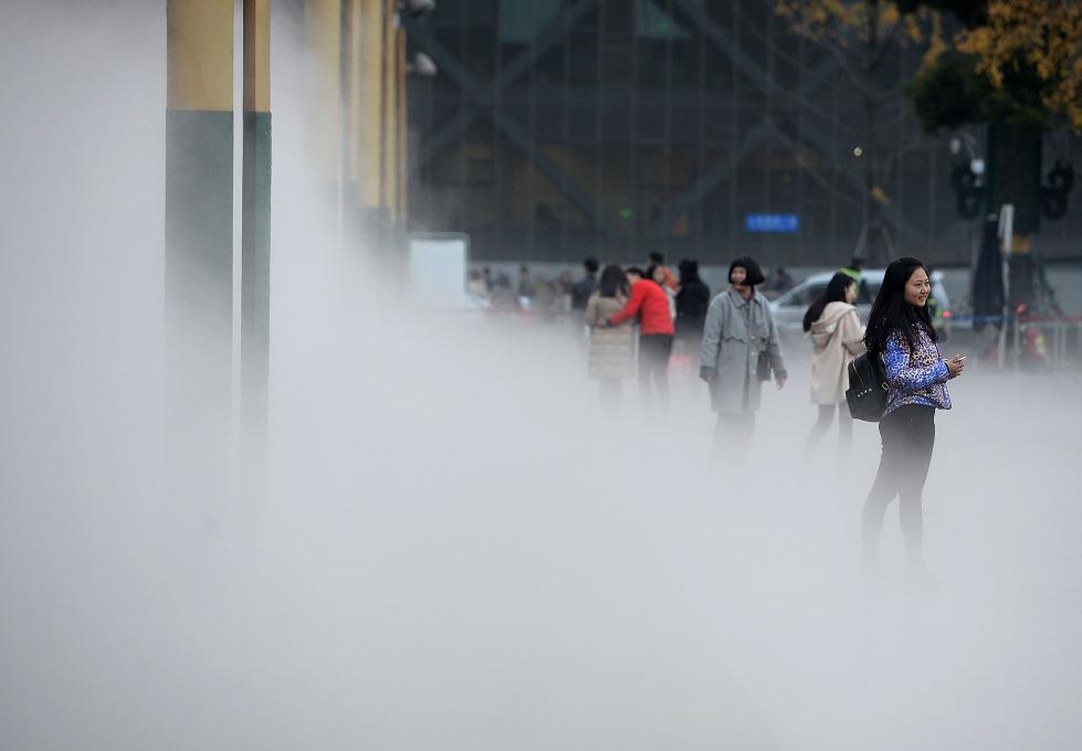 2017年12月23日,成都。天府廣場西側(cè)和南側(cè)有了新變化——上午10點(diǎn),綠油油的草坪上空開始籠罩著層層白色霧氣,仿佛置身于仙境一般。走近一點(diǎn),還有水霧襲來,平添一分清新和涼意。