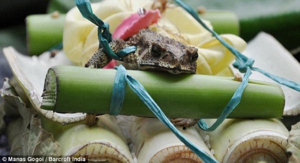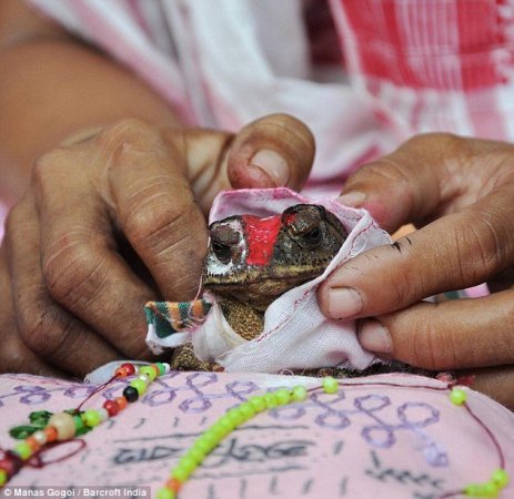 人們從四面八方的村子趕過來參加6月27日舉行的時(shí)長(zhǎng)6個(gè)小時(shí)的奇妙的婚禮。達(dá)斯介紹有超過1000多人參加了在當(dāng)?shù)毓珗@舉行的婚禮。兩只青蛙被用傳統(tǒng)顏色盛裝打扮,其中雌性青蛙甚至被村民用金色的鏈子纏裹住。
