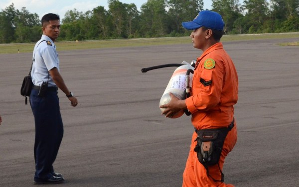 當(dāng)?shù)貢r(shí)間2014年12月30日,印尼龐卡蘭布翁,雅加達(dá)空軍基地指揮官M(fèi)arshal Dwi Putranto正在展示從現(xiàn)場打撈上來的一個(gè)緊急滑梯和乘客的行李箱。