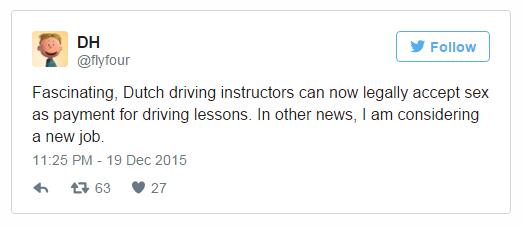 據(jù)荷蘭新聞(Dutchnews)網(wǎng)站12月14日?qǐng)?bào)道了該國(guó)議會(huì)一件令人震驚的決議——駕校教練可以用性回報(bào)代替現(xiàn)金來收費(fèi)。這一消息引起媒體大嘩,大約一周后(21日),各國(guó)媒體議論紛紛。赫芬頓郵報(bào)的副標(biāo)題就是“Ride for a ride”意為可以用性來?yè)Q一段路程,CNN報(bào)道稱:“Go Dutch”現(xiàn)在有了新的意味,因?yàn)闅W洲男性開始涌向荷蘭,遞交擔(dān)任駕校教練申請(qǐng)。根據(jù)荷蘭政府方面的消息,申請(qǐng)量比之前增加了5倍。