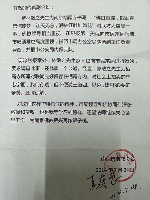7月24日,傳真法師收到一封南京市佛教協(xié)會的回函?;睾Q,除了傳真法師報(bào)案外,林散之家人也向市民宗局反映,要求調(diào)查此事,還林家一個公道。